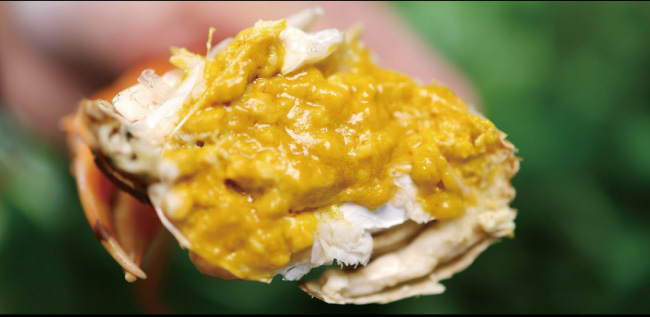 黃油相融,難分彼此。油膏浸滿整只蟹身,腹肉、蟹腿、蟹螯,甚至蟹腮,全身都金黃透光。細細品嘗,渾身散發一股霸道的鮮甜,是普通青蟹的10余倍,簡直就是“人間尤物”。